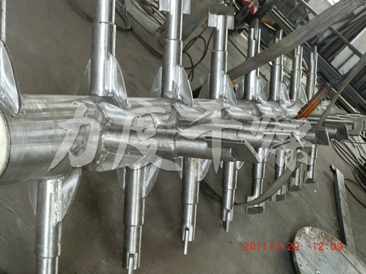 攪拌軸:有常規(guī)型(不加熱)和空芯型兩種,空芯型攪拌軸內(nèi)部設(shè)有套管,用于軸及耙臂內(nèi)熱媒的進(jìn)入和排出。耙臂焊接在攪拌軸上,耙臂上方設(shè)有帶傾角的耙片(也叫抄板),靠近筒體的耙片真空耙式干燥機(jī)-中試設(shè)備-常州市力度干燥設(shè)備有限公司在旋轉(zhuǎn)過(guò)程中清理附著在筒體壁上的物料,使間壁傳熱表面不斷更新,利于物料混合和熱量傳導(dǎo)。